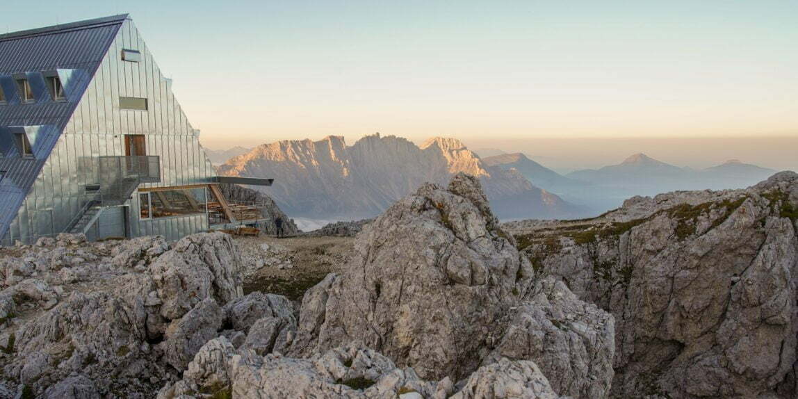 Das futuristisch anmutende Haus trotzt jeglichen Wetterverhältnissen. Das muss es auch. Es ist eine der höchsten bewirtschafteten „Hütten“ in Südtirol auf 2734 m ü.NN. Mit ihrer exponierten Lage direkt an einer Felskante ist die Santnerpasshütte extremen Wetterbedingungen ausgesetzt. Deshalb muss die Konstruktion Windgeschwindigkeiten von bis zu 200 km/h standhalten.